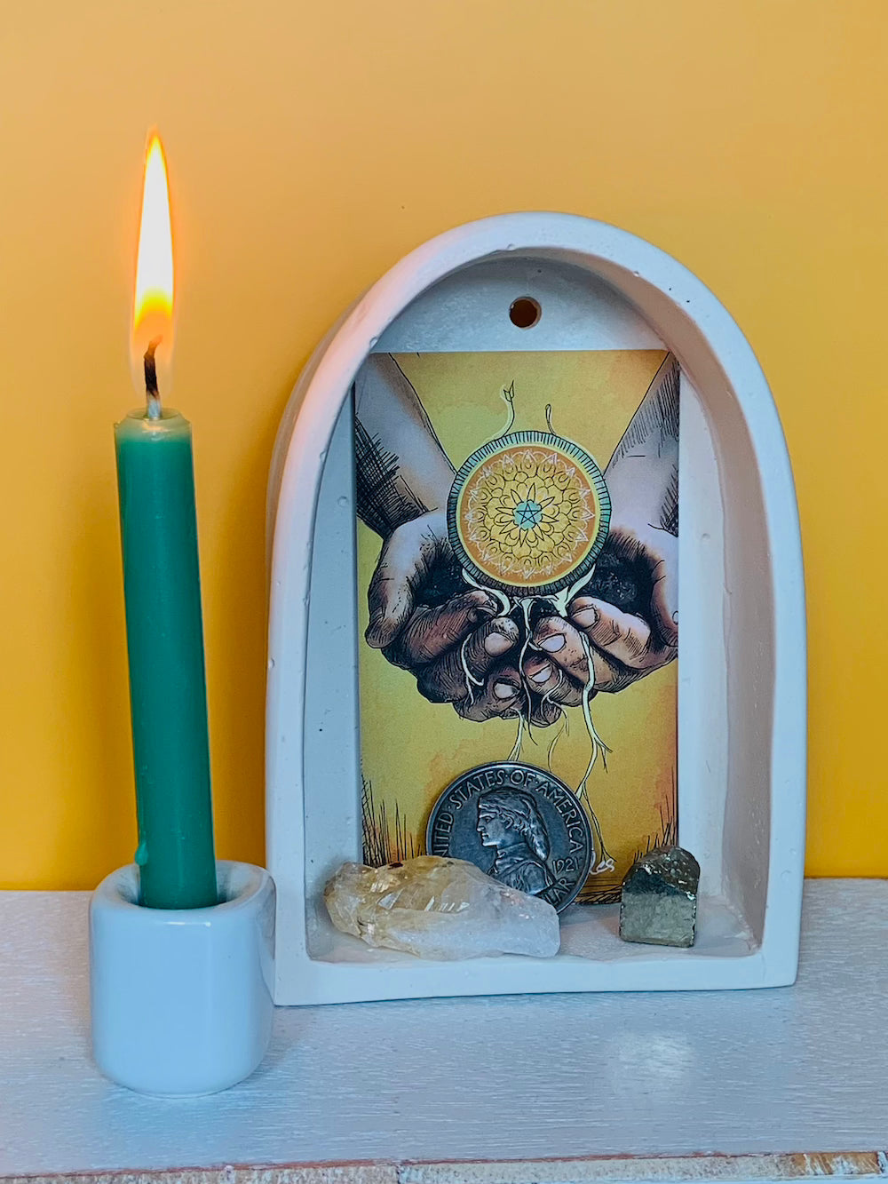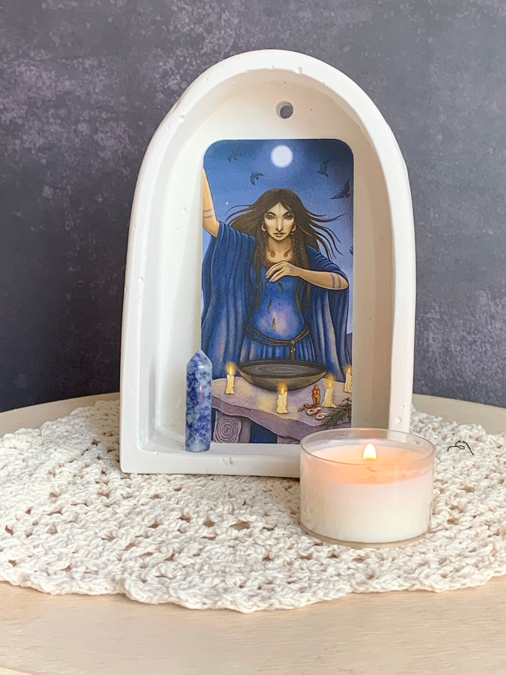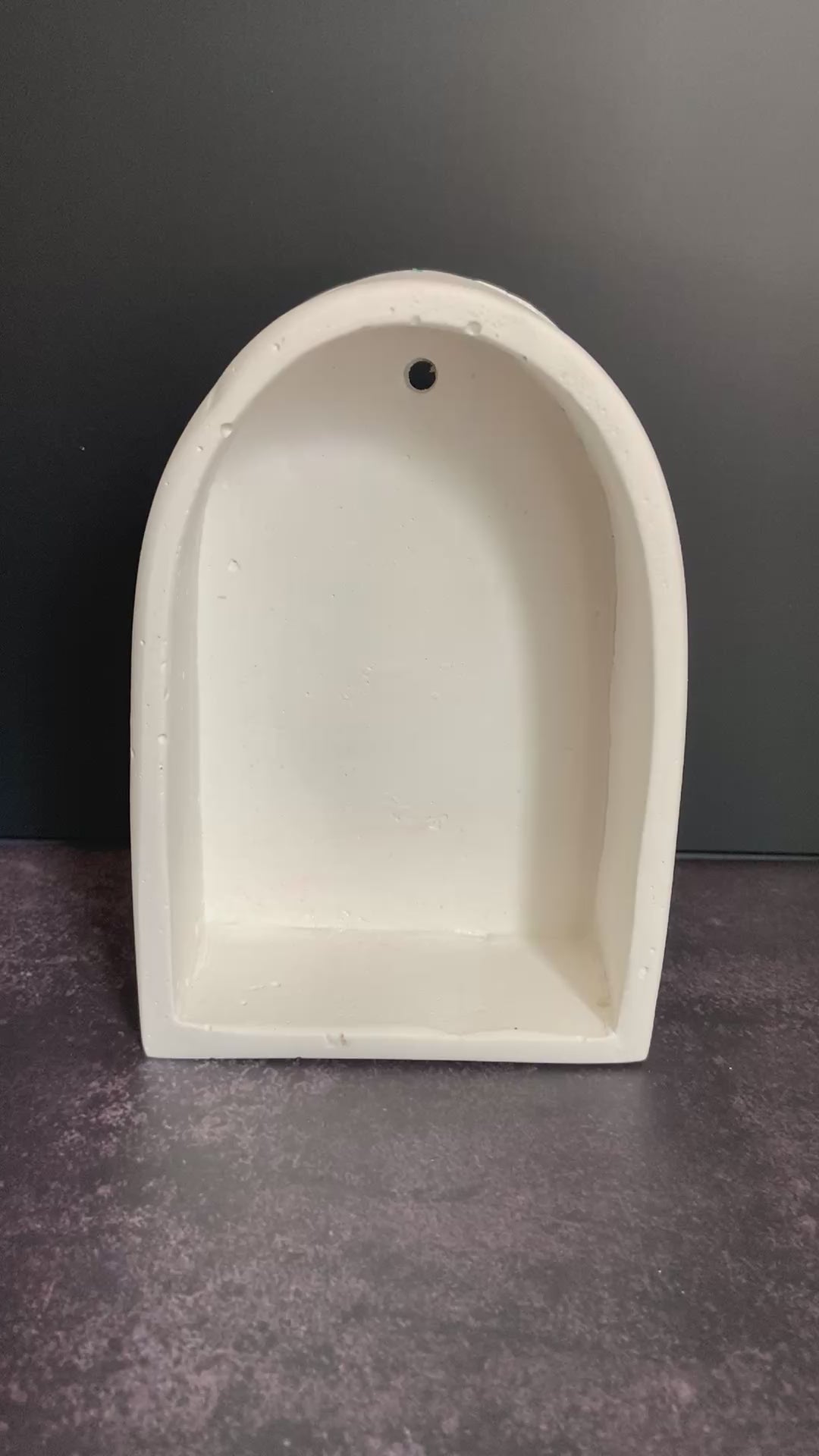 The Alcove Niche is a hand-poured sanctuary of gypsum cement, its soft arch reminiscent of old stone niches where prayers once lived. It invites you to create a focal point for the energies you work with—be it a favorite crystal, a deity figure, a keepsake from the land, or a card drawn for the day’s magic.