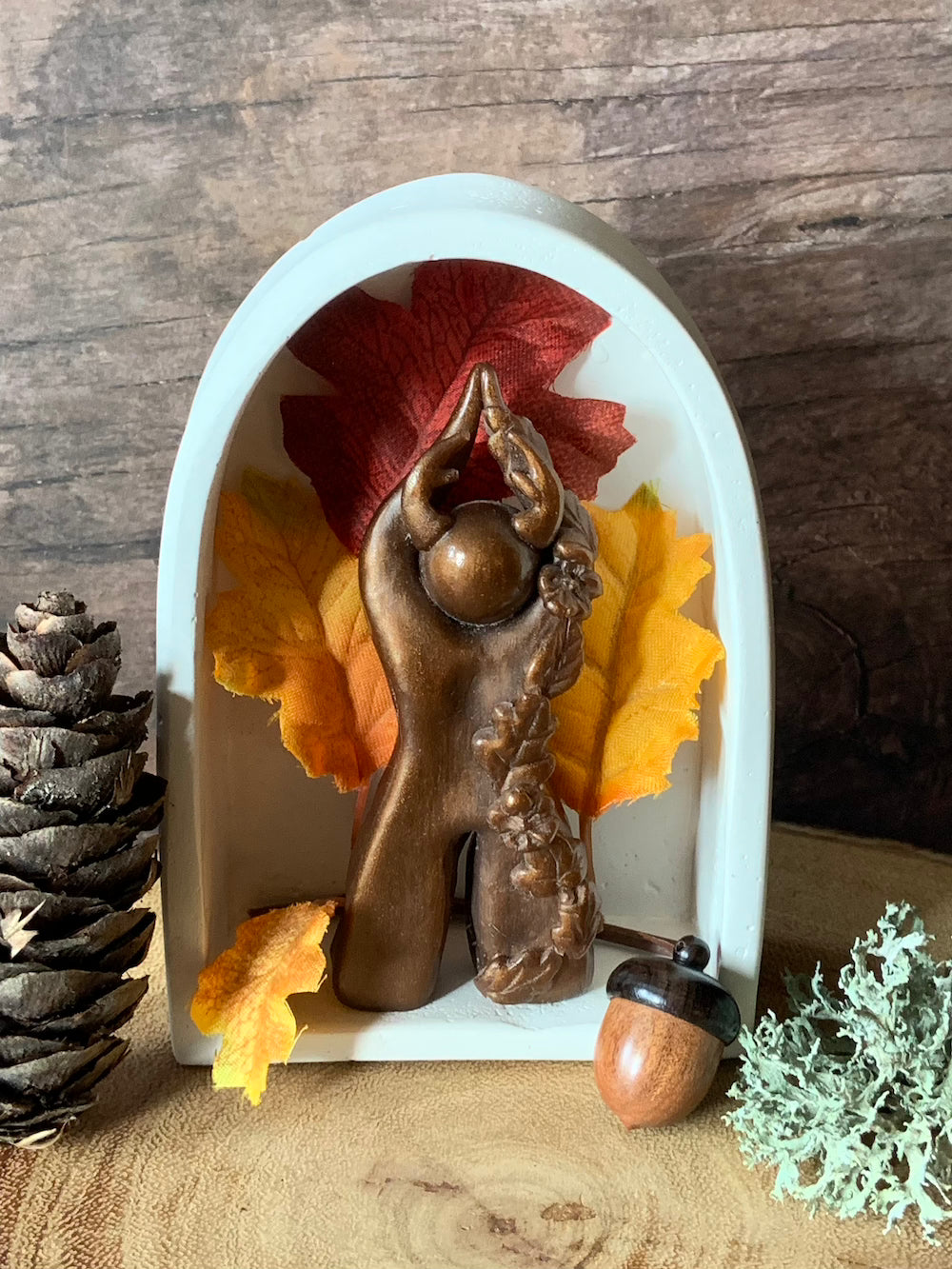 A pocket-sized Tarot or Oracle card fits perfectly in its embrace, transforming this shrine into a personal message board from the Divine. Whether used to cradle moon offerings, ancestral tokens, or spell intentions, this small space opens wide in meaning.